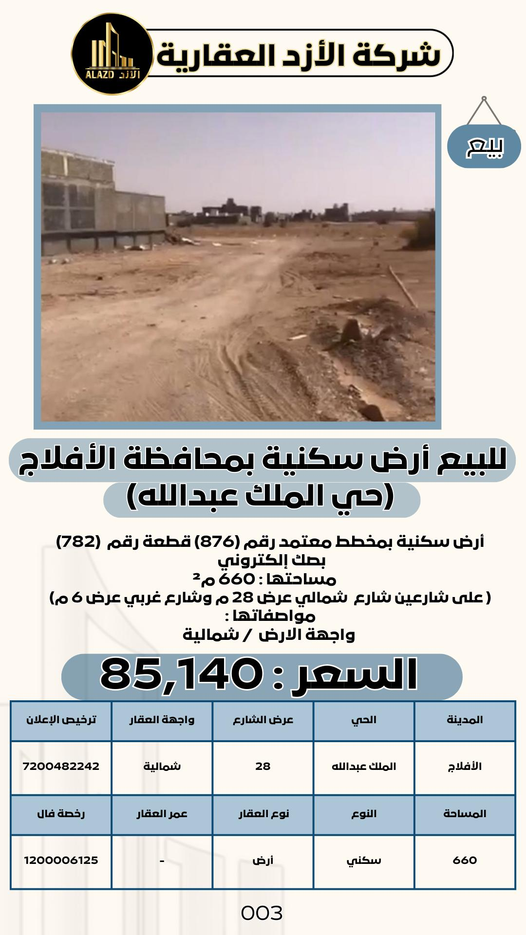 للبيع أرض سكنية بمحافظة الأفلاج (حي الملك عبدالله)