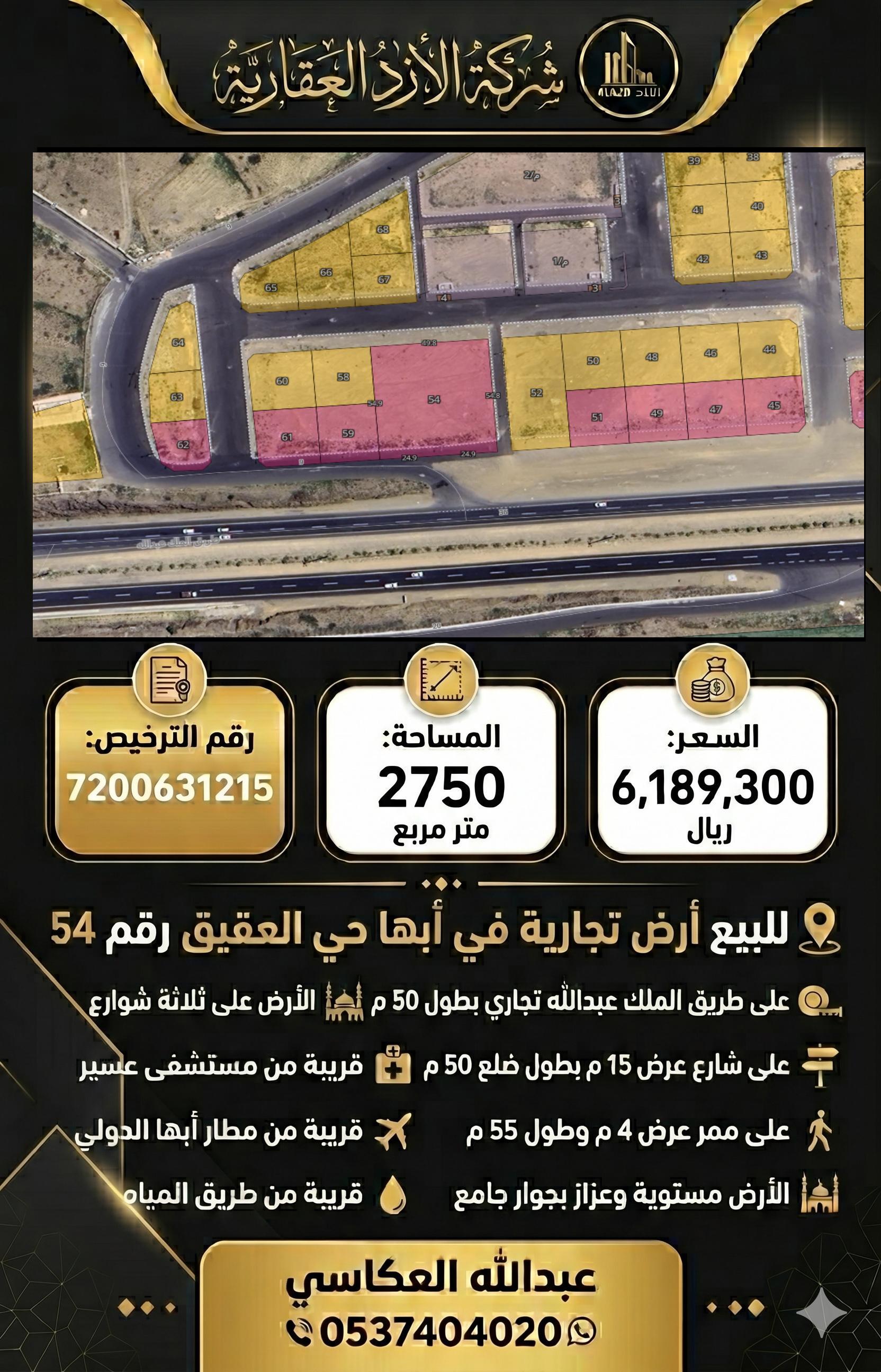 طول الضلع على الطريق 50 م وعلى شارع عرض 15 م طول الضلع 50 م وعلى ممر عرض 4 م 55 م الأرض مستويه وعزاز بجوار الأرض جامع قريبه من مستشفى عسير