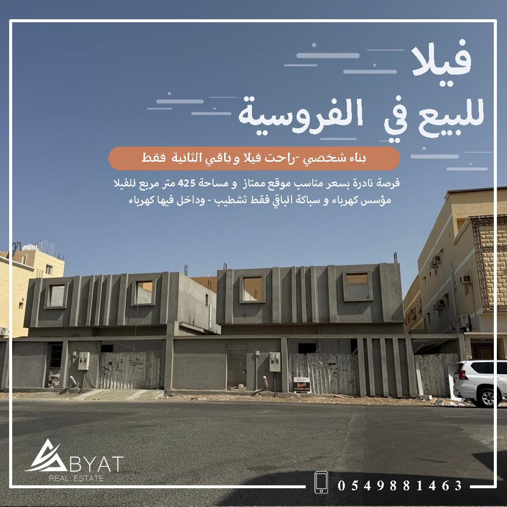 فيلا للبيع في الفروسية بجدة فيلا دور مساحة 425 متر مربع على حرف تي مكون من 6 غرف يوجد مخطط للفيلا للمعاينة تفضل بالتواصل معنا الفيلا دور ارضي و تصريح البناء دورين وملحق و داخل كهرباء ومجهزة كهرباء و سباكة الباقي البويات و البلاط المطلوب مليون