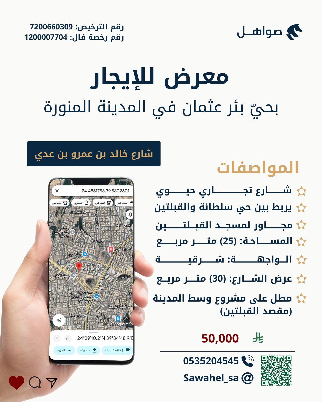 محل للإيجار بحي بئر عثمان بمنطقة المدينة المنورة مواصفات العقار: - شارع تجاري حيوي - يربط بين حي سلطانة والقبلتين - مجاور لمسجد القبلتين - المساحة: (25) متر مربع - الواجهة: شرقية - عرض الشارع: (30) متر مربع - مطل على مشروع وسط المدينة (مقصد القبلتين) الخدمات: - كهرباء - مياه - صرف صحي المطلوب: 50,000 ريال الموقع على خرائط قوقل: https://maps.app.goo.gl/gnJYmiExjf462bph8?g_st=ipc للتواصل والاستفسار: 0535204545 الترخيص الإعلاني:7200660309 رخصة فال: 1200007704 رقم العارض 1200007704 رقم الترخيص 7200660309
