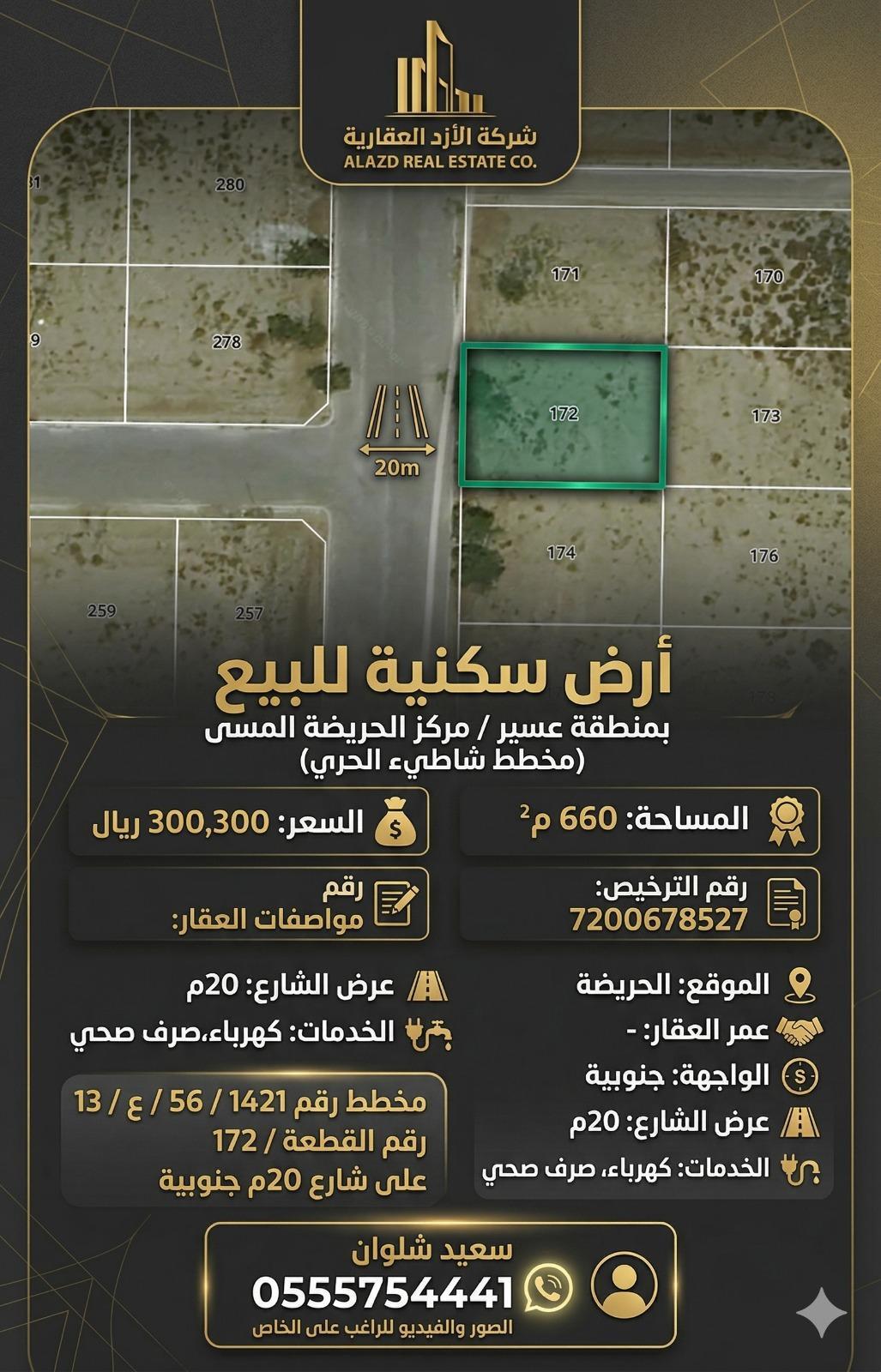 قطعة الأرض السكنية الواقعة فى الحريضة برقم 172 من المخطط رقم 56 / 1421/ ع/ 3 الواقع بمركز الحريضة .