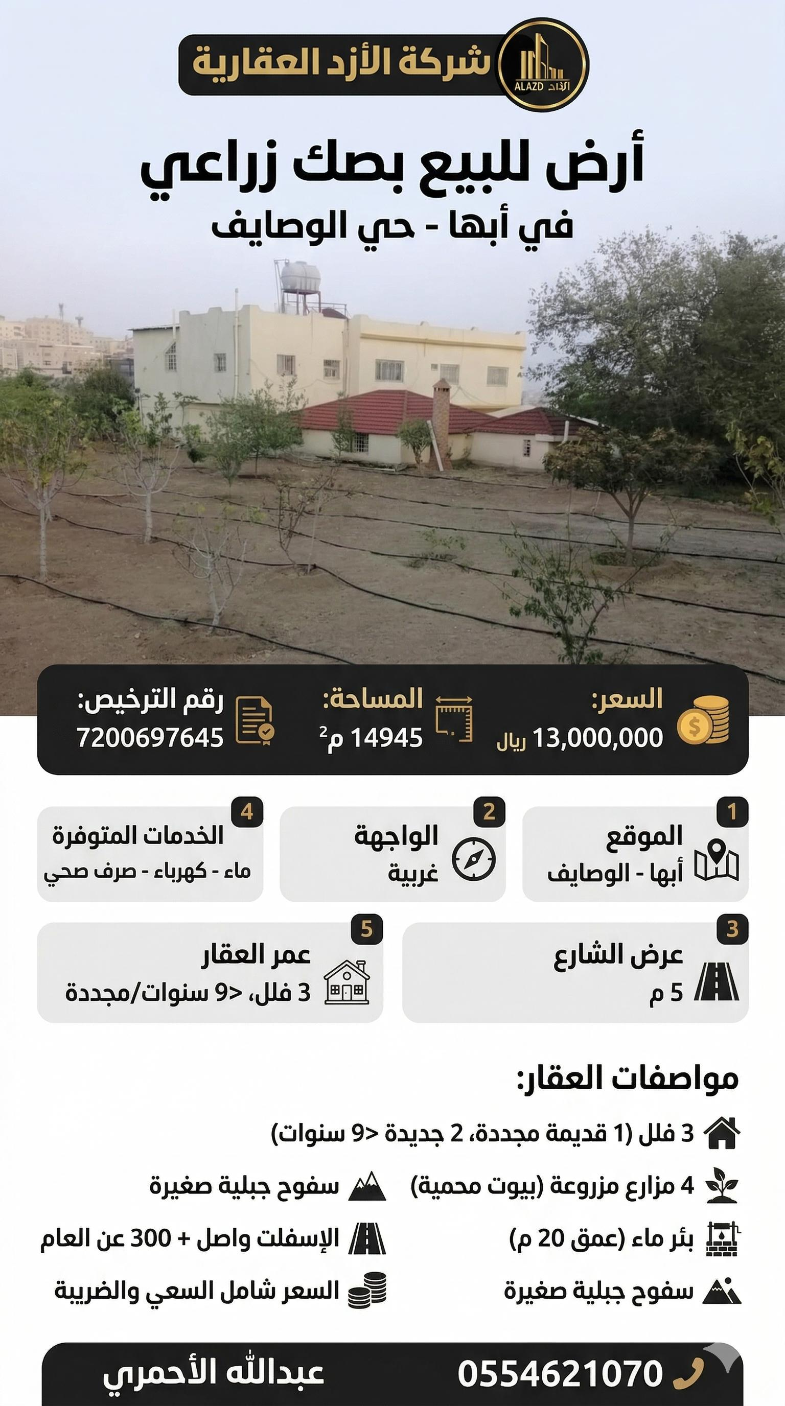 أرض للبيع بصك زراعي في أبها – حي الوصايف