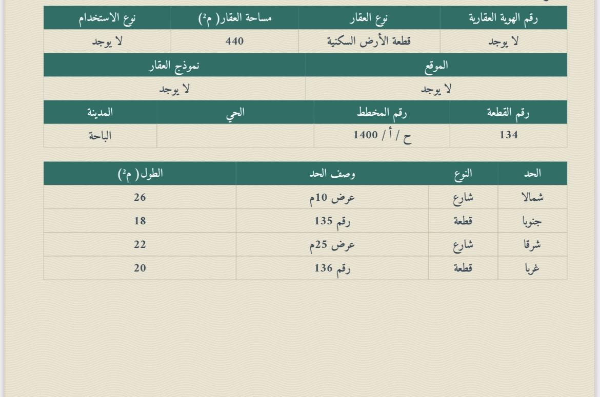 قطعة الأرض السكنية رقم 134 من المخطط رقم ح / أ/ 1400 بمدينة الباحة .