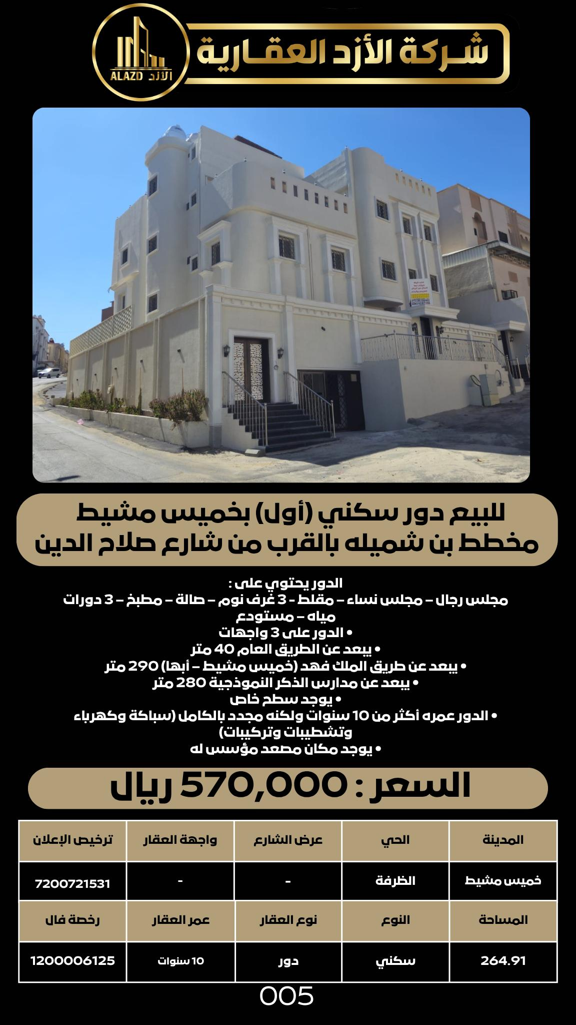للبيع دور سكني (أول) بخميس مشيط – مخطط بن شميله بالقرب من شارع صلاح الدين