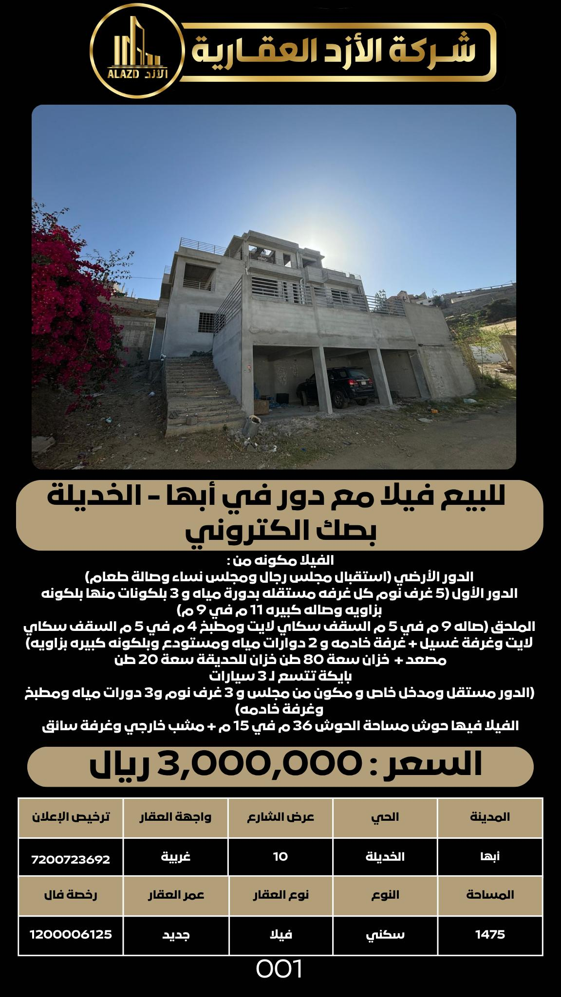للبيع فيلا مع دور في أبها - الخديله بصك الكتروني