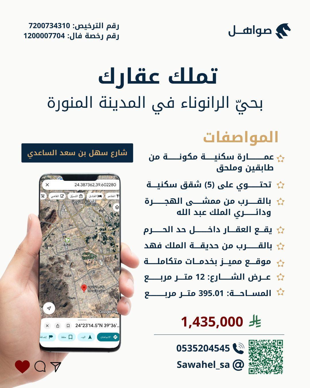 عمارة للبيع بحيّ الرانوناء بالمدينة المنورة.
