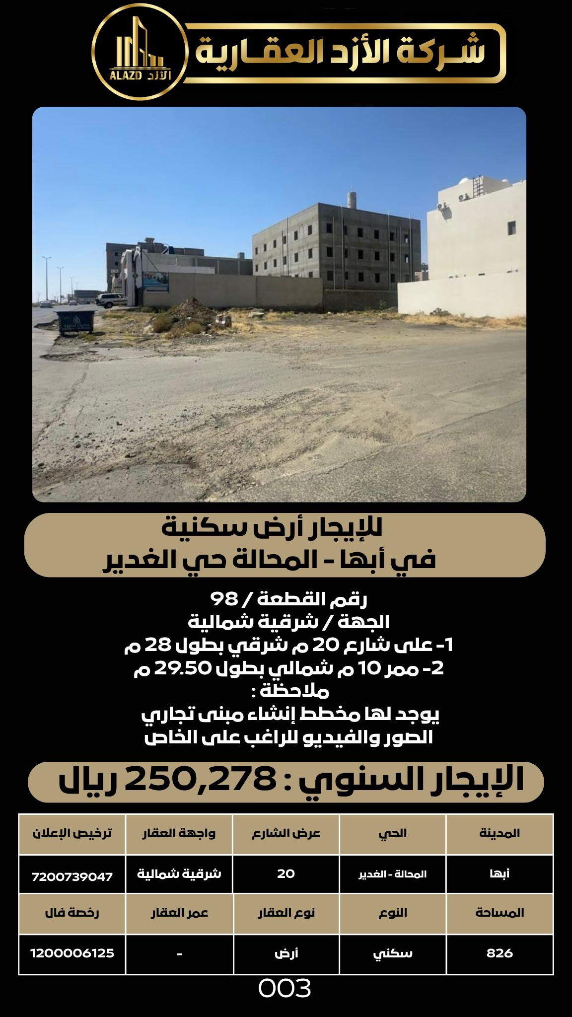 للإيجار أرض سكنية في أبها - المحالة حي الغدير