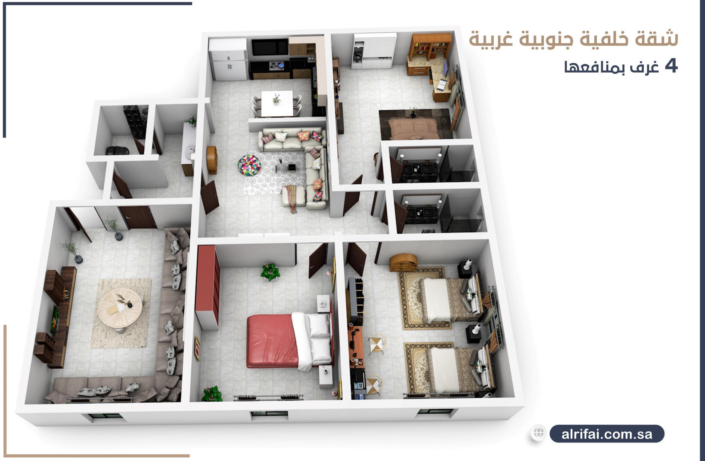 تتكون الشقة من 4 غرف نوم واسعة، مع مساحات داخلية مريحة ومرافق متكاملة.