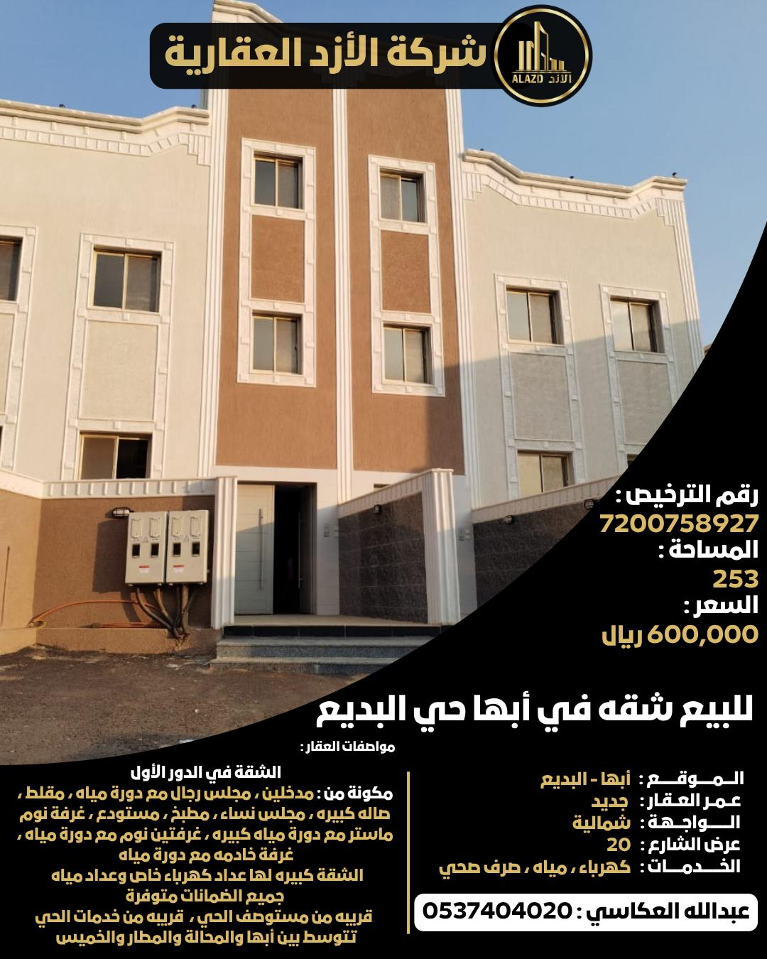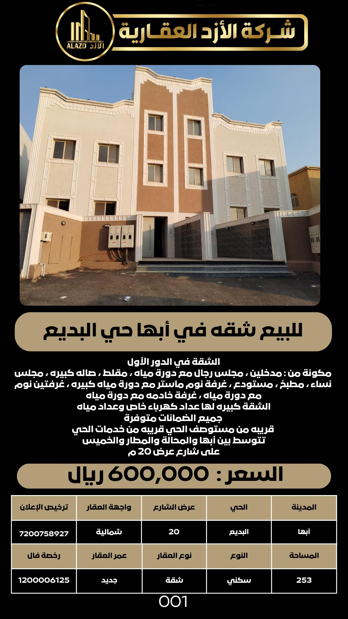 عض المزدحي شرق حى الموظفين بمدينة ابها مساحة الوحدة من الأرض 123.11 متر وتختص من المنافع والأجزاء المشتركة بمساحة 13.31 متر