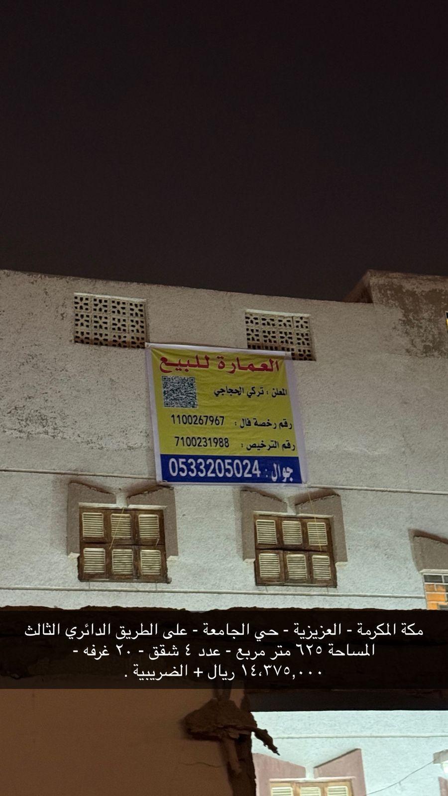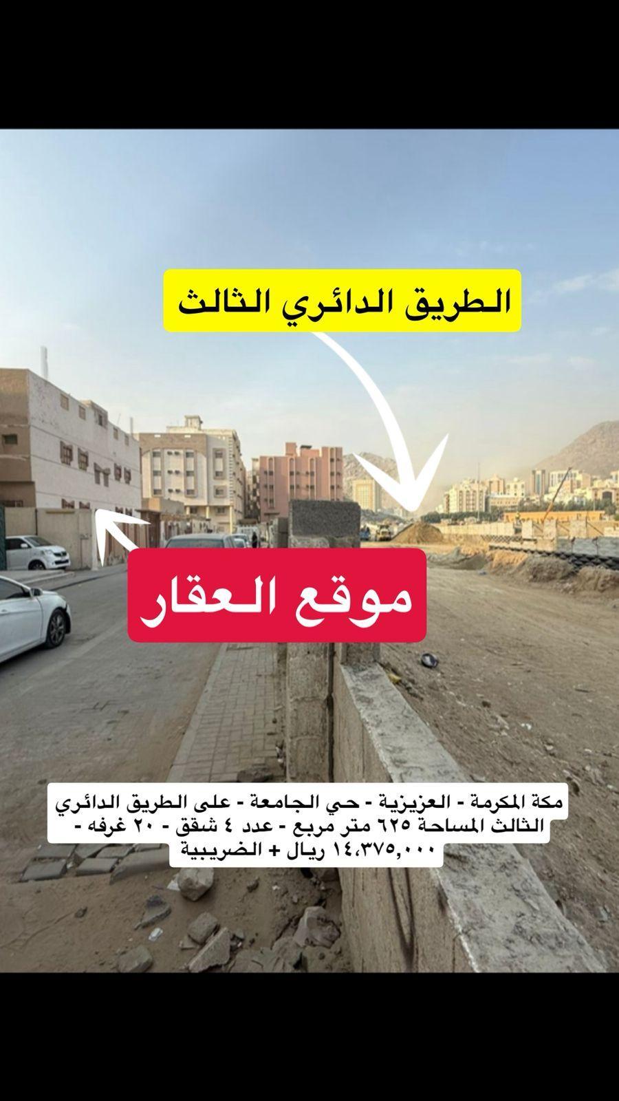 عقار للبيع / عمارة سكنية على الطريق الدائري الثالث - مكة المكرمة - حي الجامعة - العزيزية - مكونه من ٤ شقق - دورين - جميع الخدمات متوفره في الموقع - بسعر ١٤،٣٧٥،٠٠٠ ريال + الضريبة .