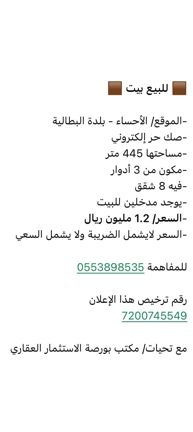 عض المزدكامل البيت أرضاً وبناء المقام على المقسم الأوسط من العقار المسمى الصباخ الواقع بقرية البطاليه بمدينة المبرز بمحافظة الأحساء .