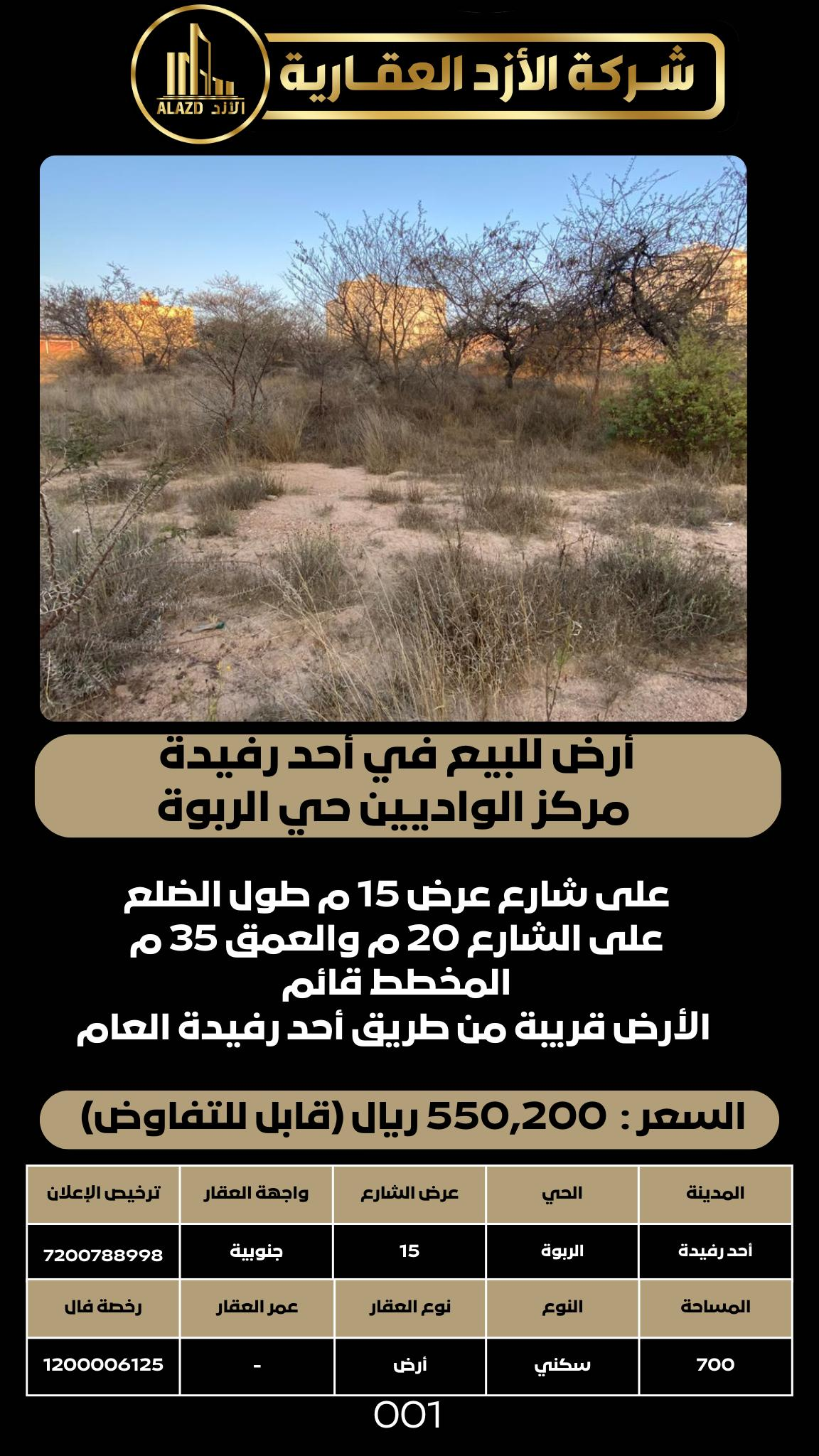 أرض للبيع في أحد رفيدة مركز الواديين حي الربوة