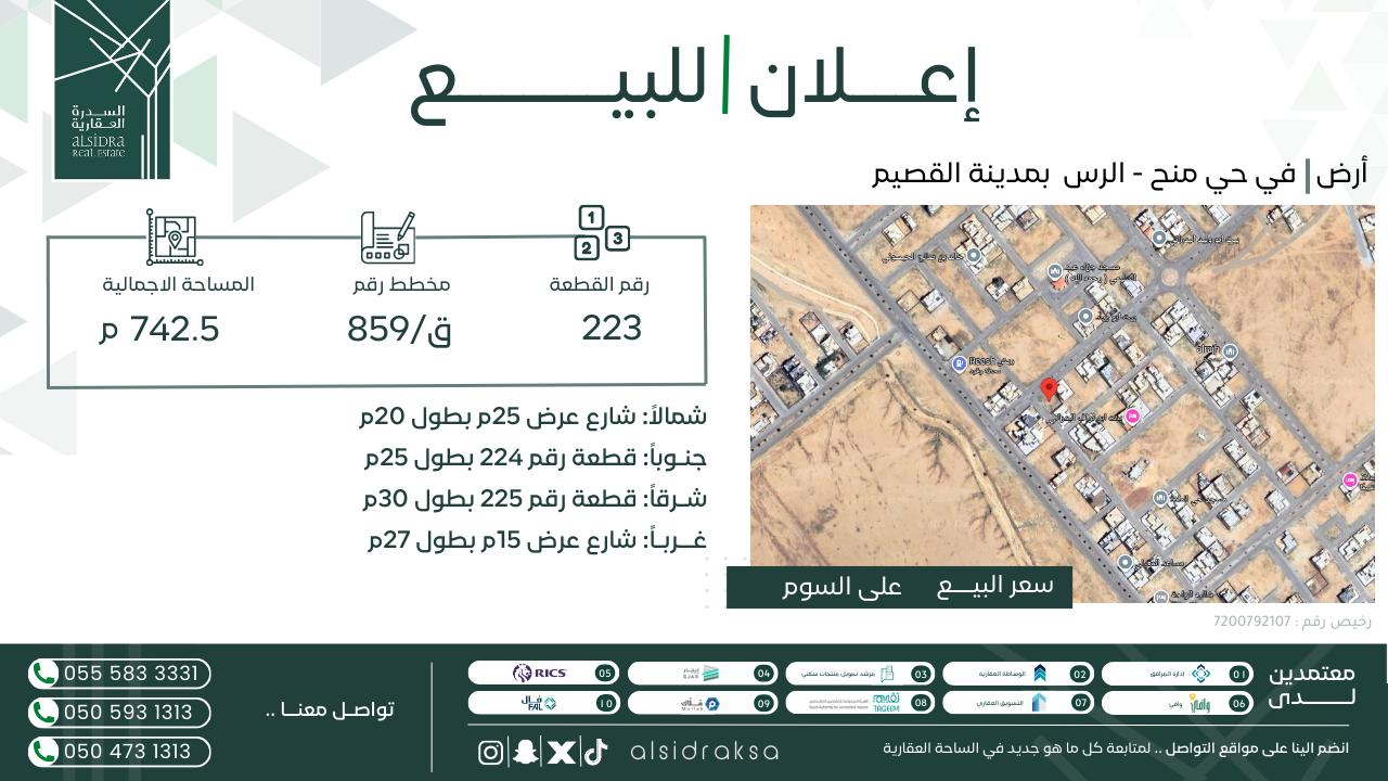 عض المزدقطعة الارض رقم 223 من المخطط رقم 859 / ق بمركز قصر ابن عقيل بمحافظة الرس .