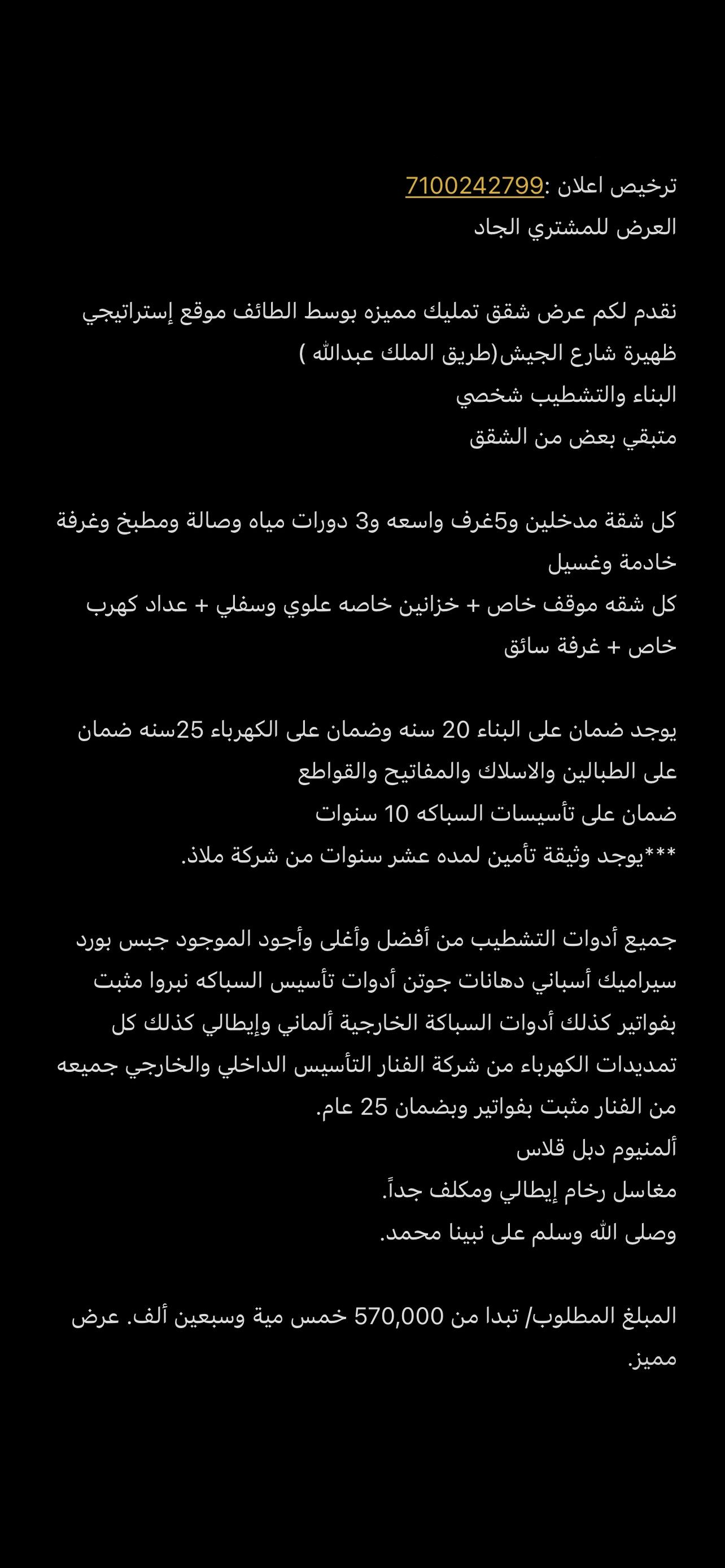المبلغ المطلوب/ تبدا من 570,000 خمس مية وسبعين ألف. عرض مميز.