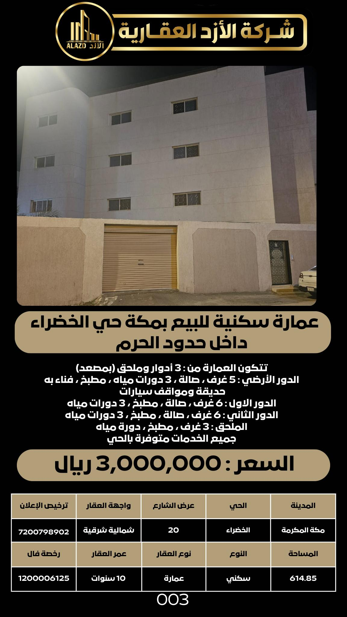 عمارة سكنية للبيع بمكة حي الشرائع داخل حدود الحرم