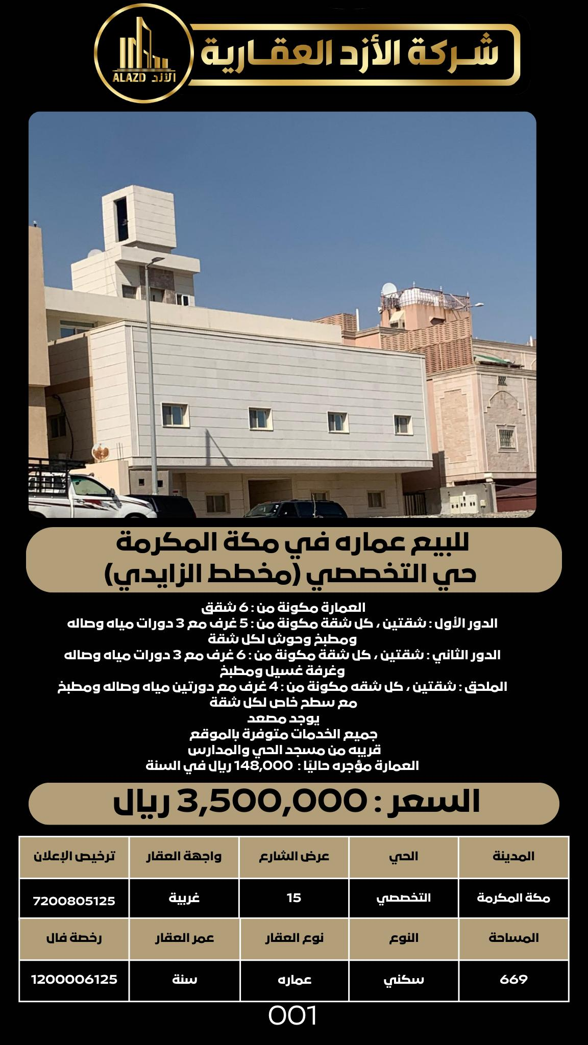 للبيع عماره في مكة المكرمة حي التخصصي (مخطط الزايدي)