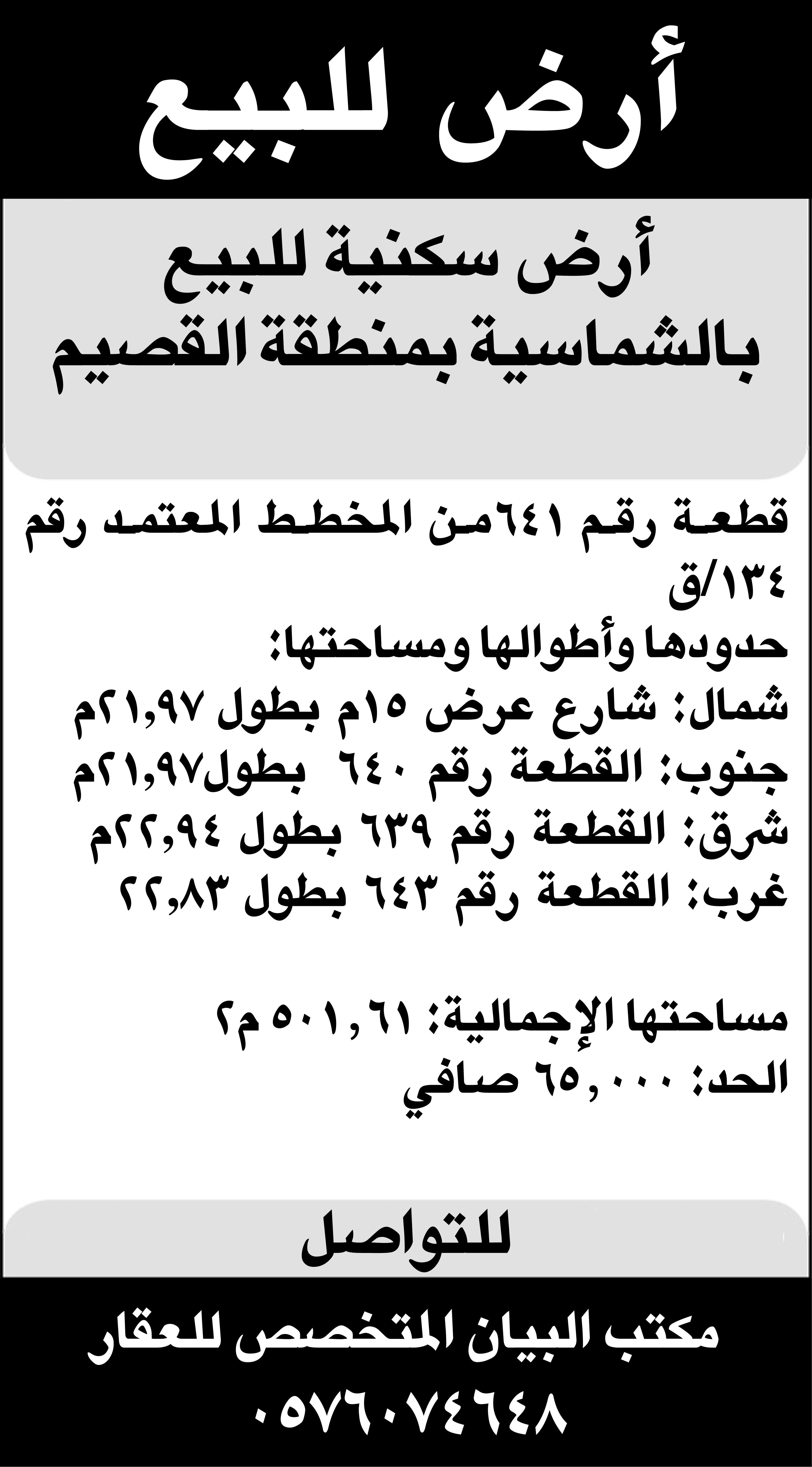 للبيع قطعة أرض سكنية المدينة : الشماسيه - منطقة القصيم الحي : السلام المساحة م2 : 501,61 رقم المخطط : 134 / ق رقم القطعة : 641 عرض الشارع : 15م الحدود والأطوال: حسب ما ورد في الرفع المساحي المرفق بالإعلان 📍الموقع: https://maps.app.goo.gl/mKKKhVm6Re1GnagP7