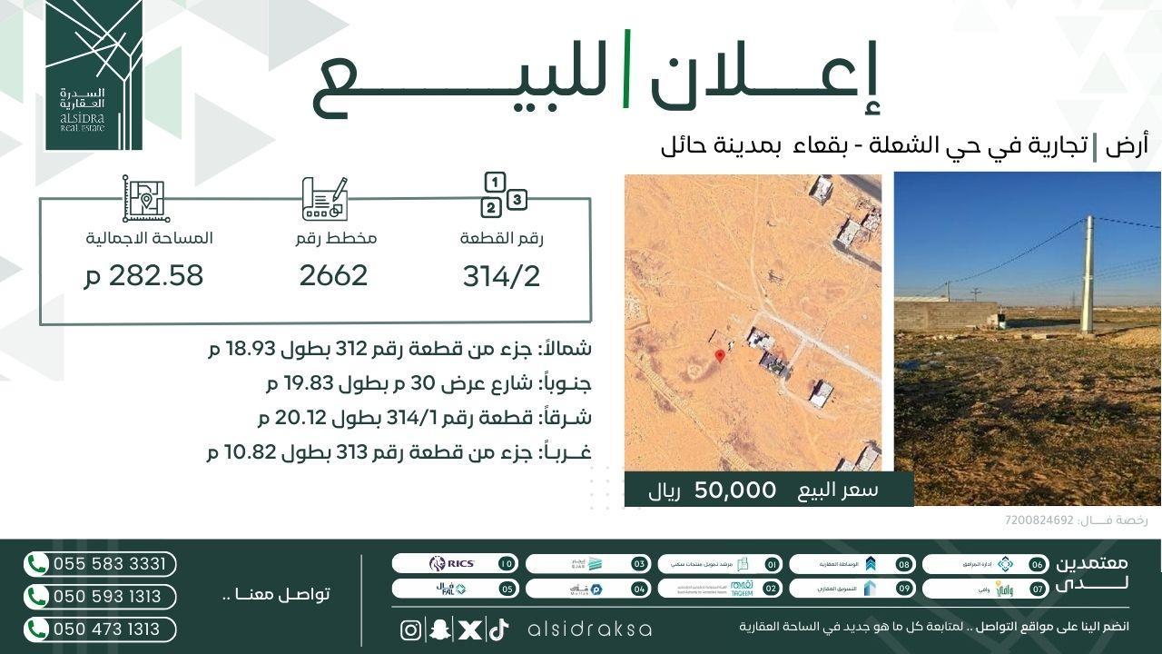 🛑للبيع ارض | تجارية في حي الشعلة - بقعاء بمدينة حائل