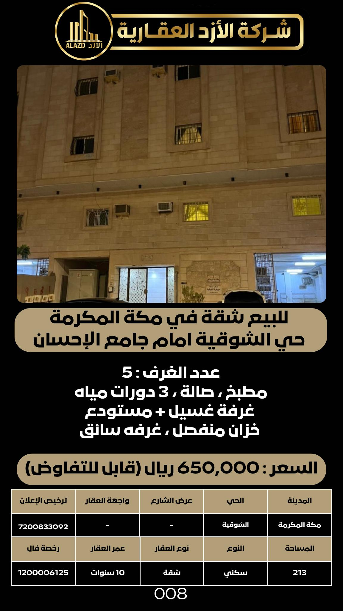 للبيع شقة في مكة المكرمة حي الشوقية امام جامع الإحسان