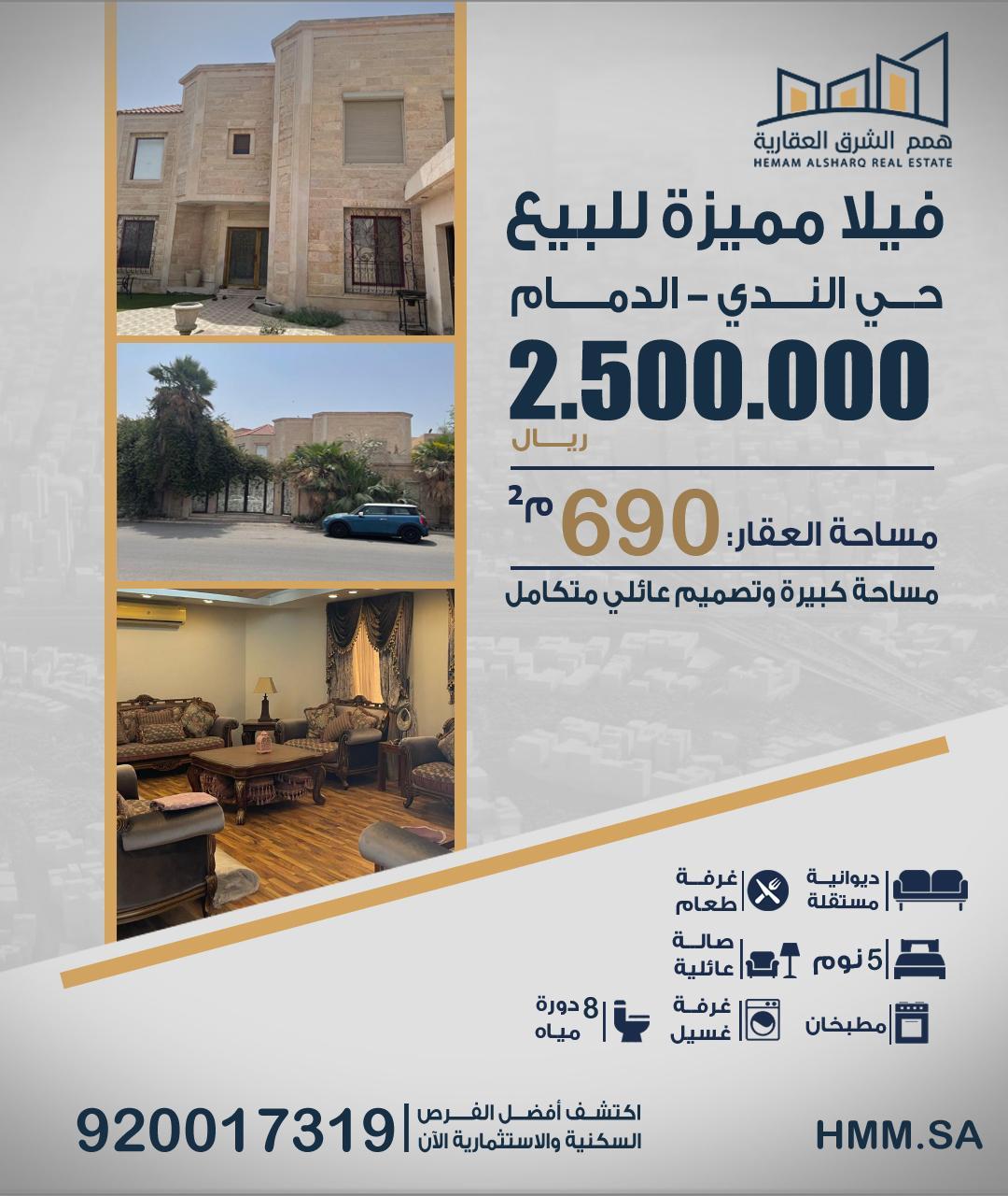 فيلا مميزة للبيع – حي الندي - الدمام مساحة كبيرة وتصميم عائلي متكامل 📐 مساحة العقار: 690 م² 🧭 الواجهة: شمالية 🛣 عرض الشارع: 18 متر 🏗 عمر الفيلا: حوالي 18 سنة ✅ المالك: المستفيد الأول 🏠 تفاصيل ومكونات الفيلا 🔹 الملحق الخارجي والحوش: ديوانية مستقلة مغاسل + دورة مياه مستودع غرفة سائق مستقلة 🔹 الدور الأرضي (ضيافة + معيشة): مجلس رجال رسمي مع مغاسل ودورة مياه مقلط متصل بالمجلس مطبخ داخلي واسع + مستودع مطبخ خارجي على الارتداد غرفة غسيل مستقلة غرفة شغالة مع دورة مياه صالة عائلية مفتوحة على كامل المبنى غرفة حريم مع دورة مياه مكتب صغير (مثالي للعمل أو الدراسة) 🔹 الدور الأول (خصوصية كاملة): 3 أجنحة نوم ماستر: جناح رئيسي واسع مع غرفة ملابس ودورة مياه جناح ثاني مع غرفة ملابس ودورة مياه جناح ثالث مع غرفة ملابس ودورة مياه 🔹 السطح: غرفة متعددة الاستخدامات دورة مياه ✨ مميزات الفيلا: واجهة شمالية مميزة مساحة أرض كبيرة 690 م² توزيع ذكي للمساحات يناسب العائلات الكبيرة فصل واضح بين مناطق الضيافة والمعيشة جميع غرف النوم أجنحة ماستر ديوانية مستقلة لخصوصية أعلى مطبخين (داخلي + خارجي) مناسبة للسكن أو الاستثمار ملكية واضحة (المستفيد الأول) 💰 السعر المطلوب: 2.500.000 📞 همم الشرق العقارية 📱 920017319