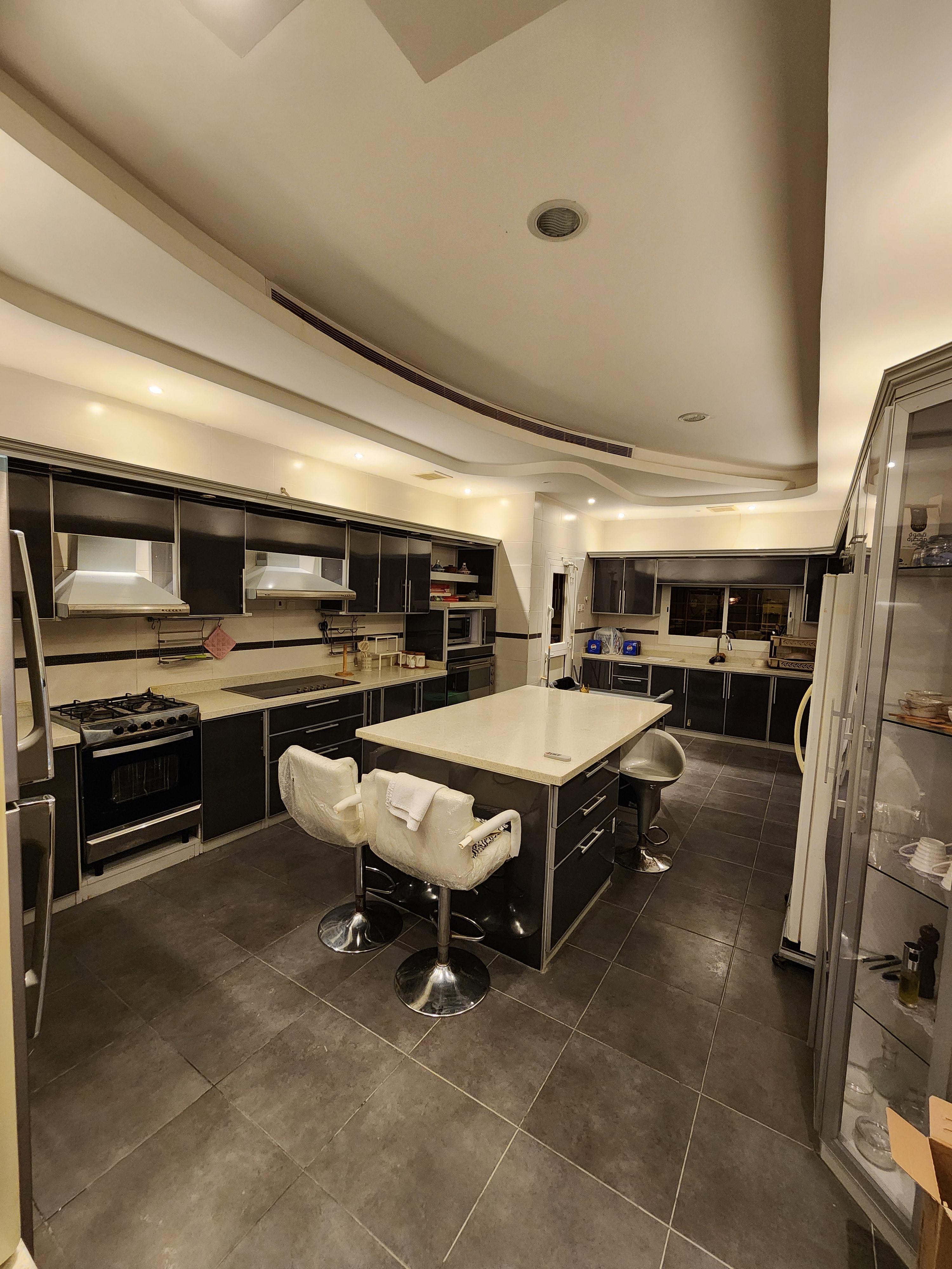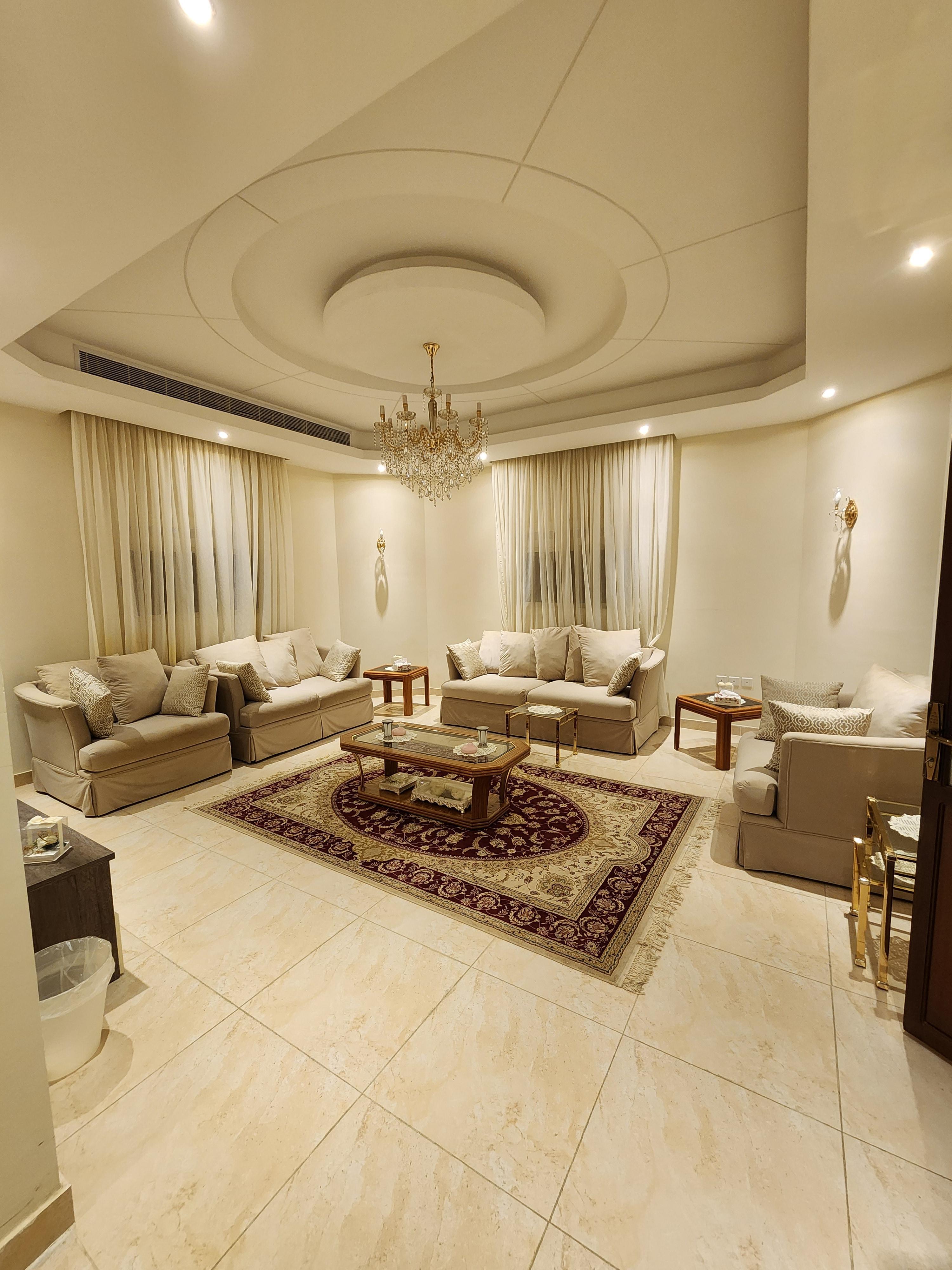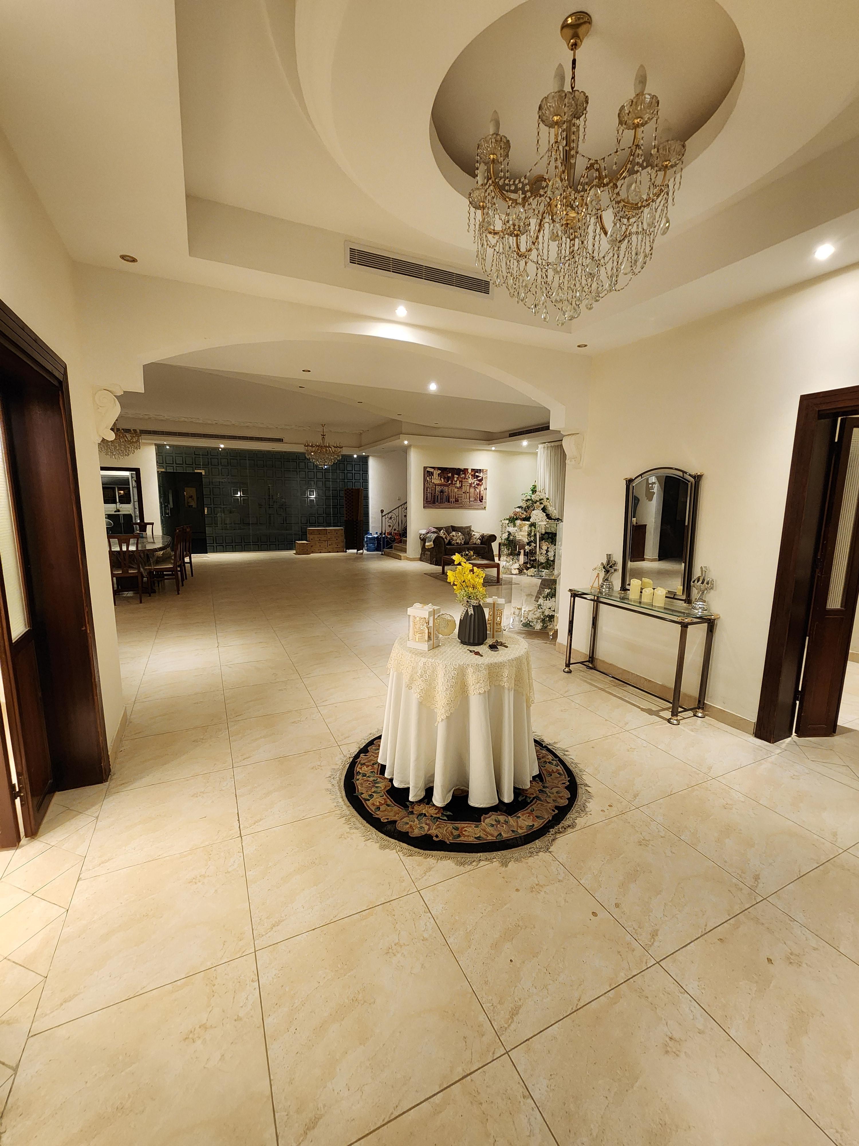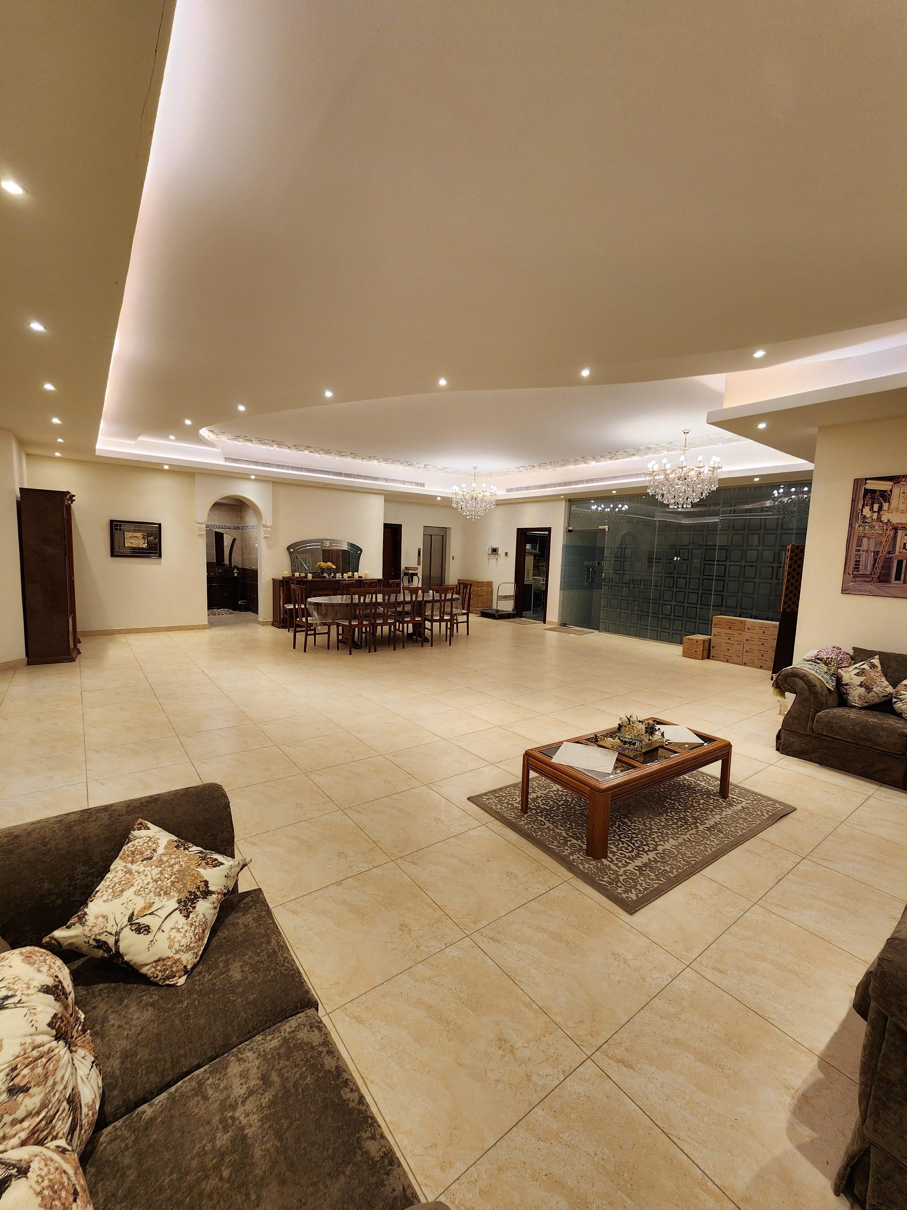 الدور الأرضي: صالة استقبال وطعام كبيرة باطلالة على المسبح. صالونين كبيرة. مغاسل ودورات مياه ضيوف. مطبخ رئيسي مؤثث بالكامل. مسبح كبير بمنافعه. فناء امامي بمساحة واسعة و فناء خلفي بمساحة واسعة. غرفة سائق خاصه.