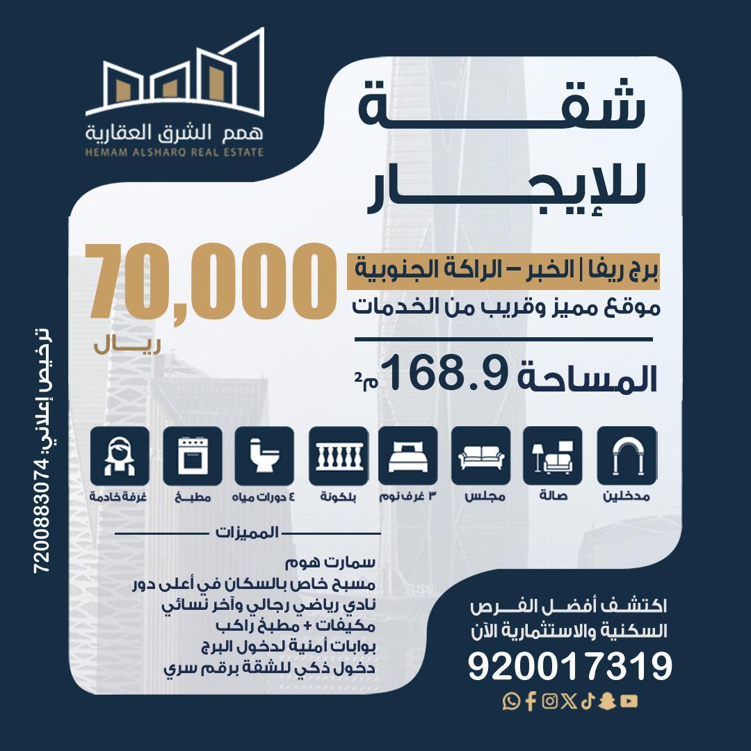 🔥 شقة للإيجار – برج ريفا | الخبر – الراكة الجنوبية 🔥