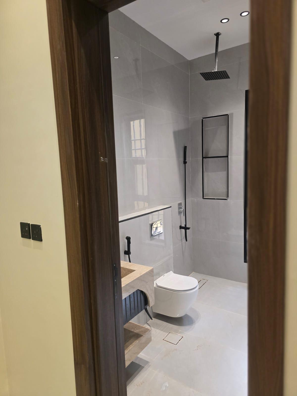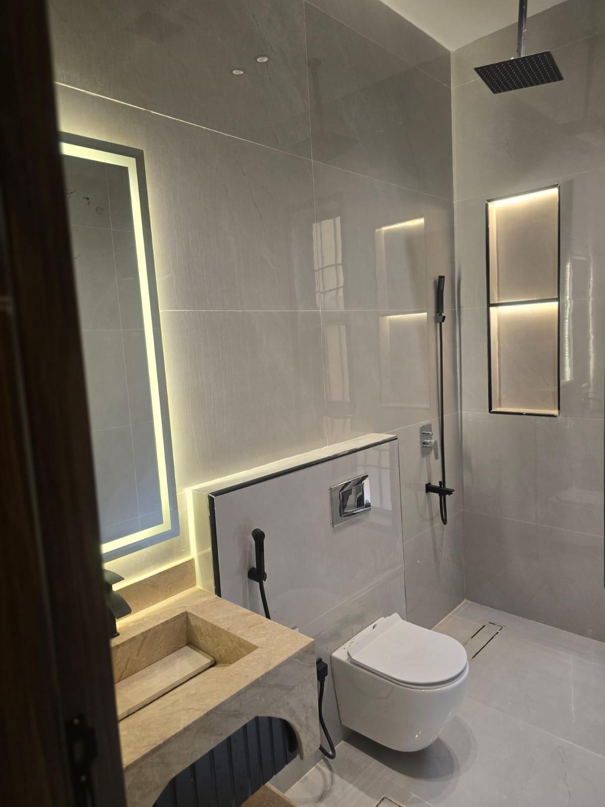 - عمر العقار: **جديد** تشطيب الترا سوبر لوكس وكراسي معلقه وكهربا الفنار ورخام طبيعي لجميع المغاسل وأبواب wpc ودخول ذكي