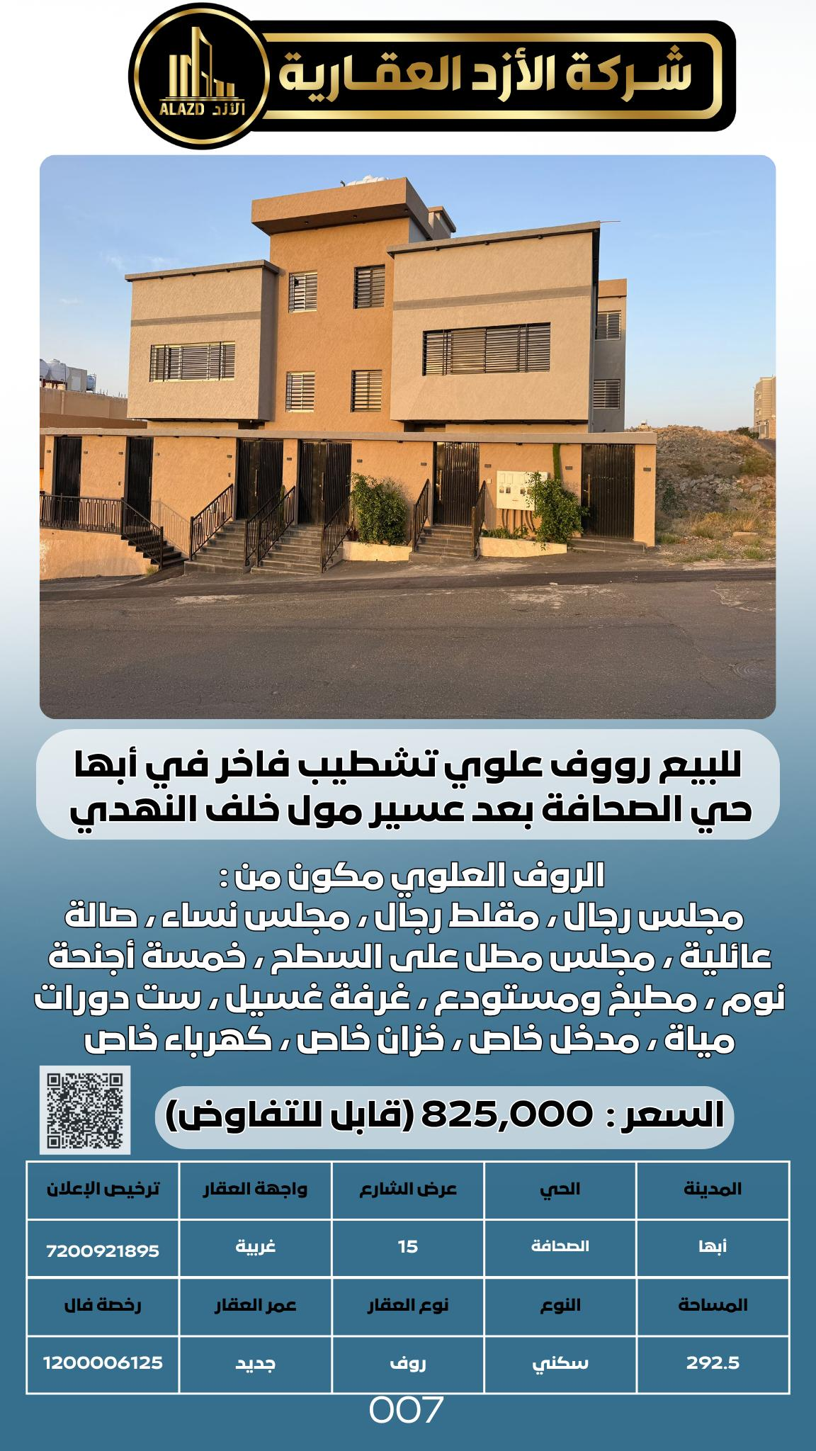 للبيع رووف علوي تشطيب فاخر في أبها حي الصحافة بعد عسير مول خلف النهدي