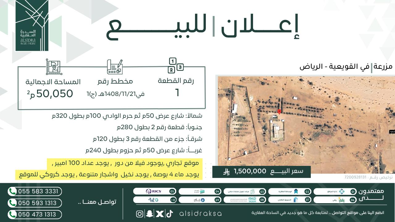 قطعة الارض الزراعية رقم 1 مخطط الزراعى 361(ج) في1408/11/21هـ بمدينة القويعية . الواقعة على بعد 8 كم شرق القويعية 5.5 كم جنوب خط السريع