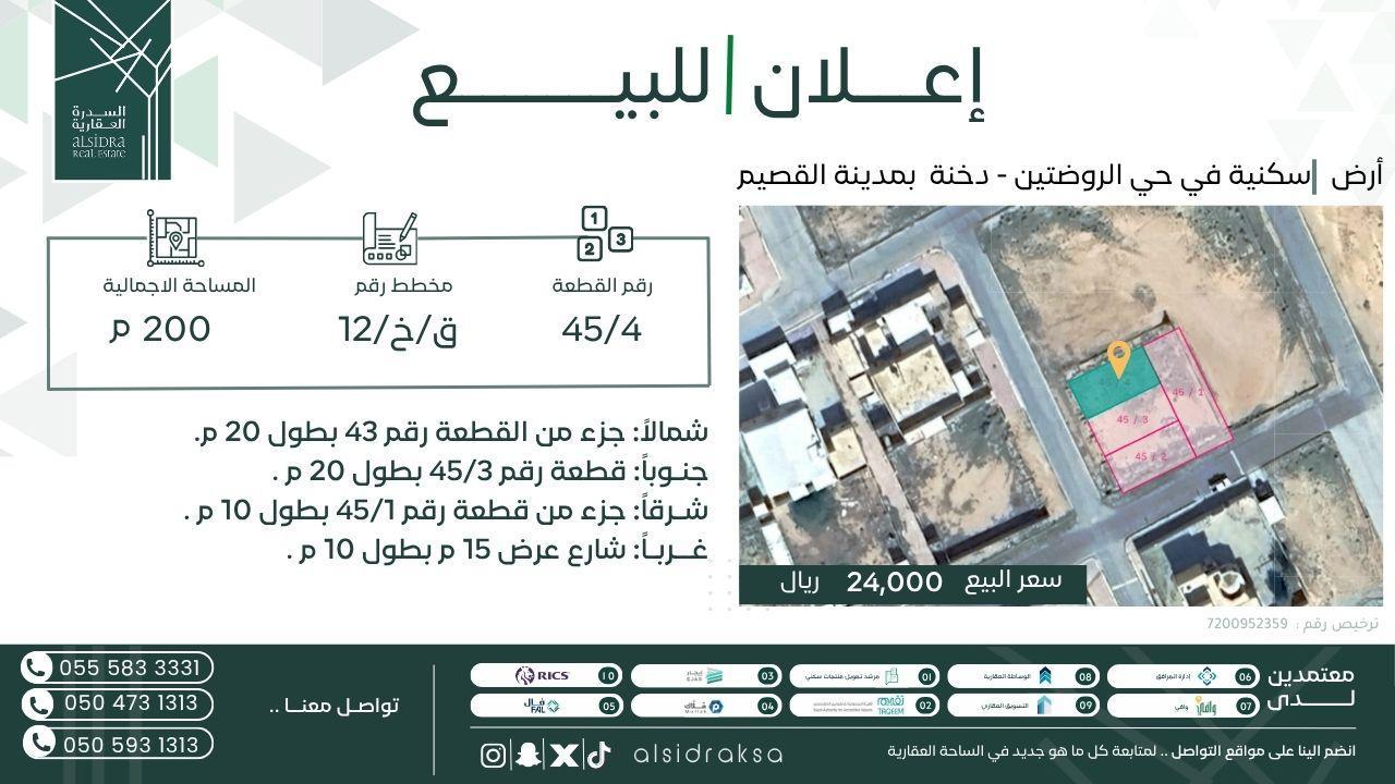 🛑للبيع ارض | سكنية في حي الروضتين - دخنة بمدينة القصيم